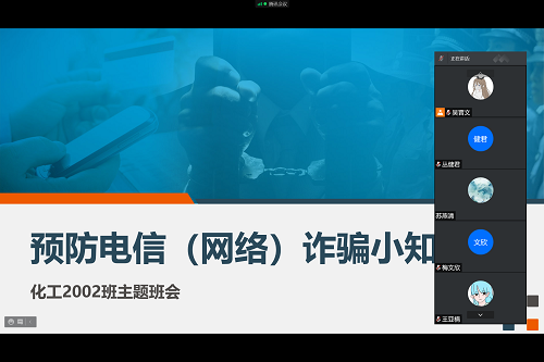 2021年11月4日晚九点半,化学工程与工艺2002班于腾讯会议线上召开“预防电信诈骗”主题班会活动,本次班会由班长吴晋文同学主持,化工2002班全员参与。