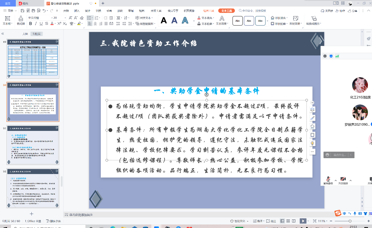 特色资助工作进行了专门介绍:全彩H漫成立了学生资助管理中心,加强获奖获助学生团队建设,通过公益岗志愿活动实践育人,设立全彩H漫爱心互助基金等。除此之外,任坤坤对奖助学金申请的基本条件和转专业同学的转入转出,综测评分细则等要点做出了详细解释。