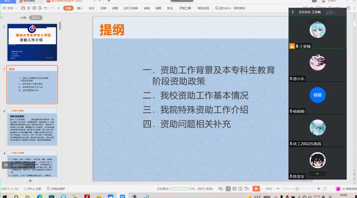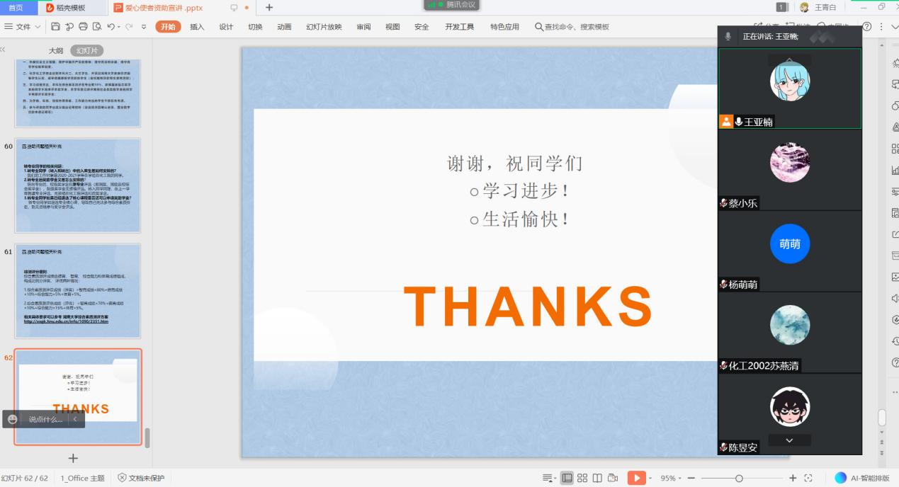 化学工程与工艺2002班在腾讯会议开展线上资助工作宣传讲座。本次讲座由爱心使者王亚楠同学主持,化工2002班全员参与。