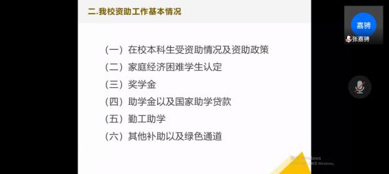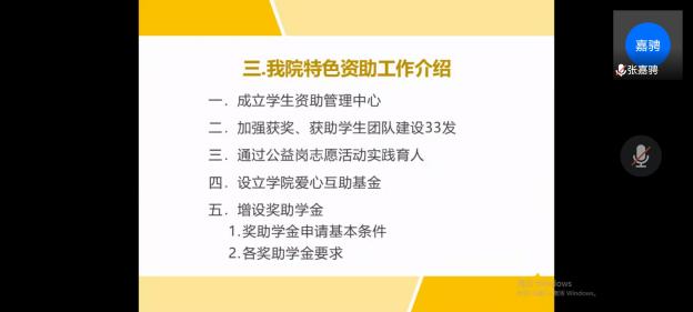 首先,张嘉骋同学作为班级爱心使者从资助工作背景及本专科生教育阶段性政策、我校资助工作基本情况、全彩H漫