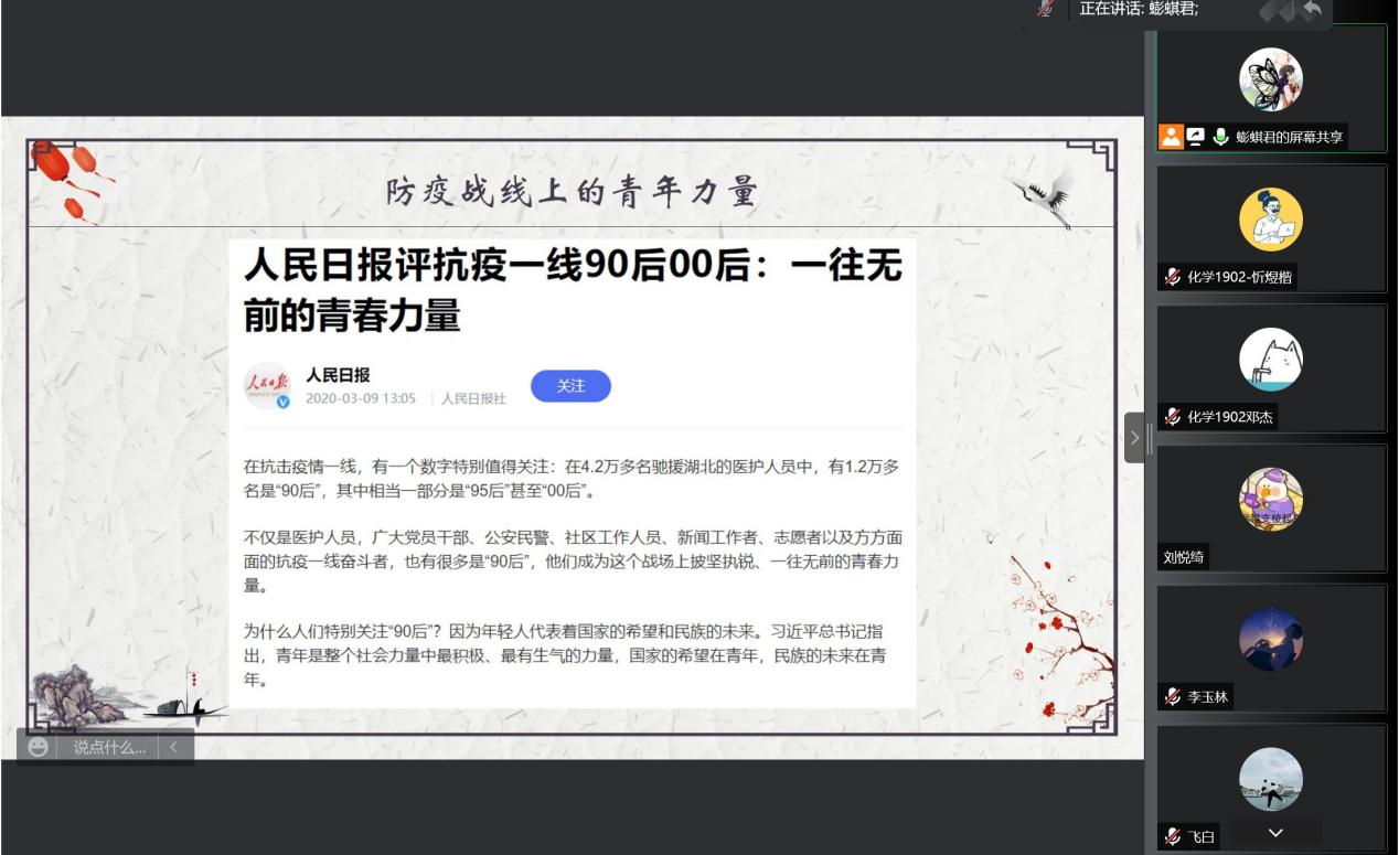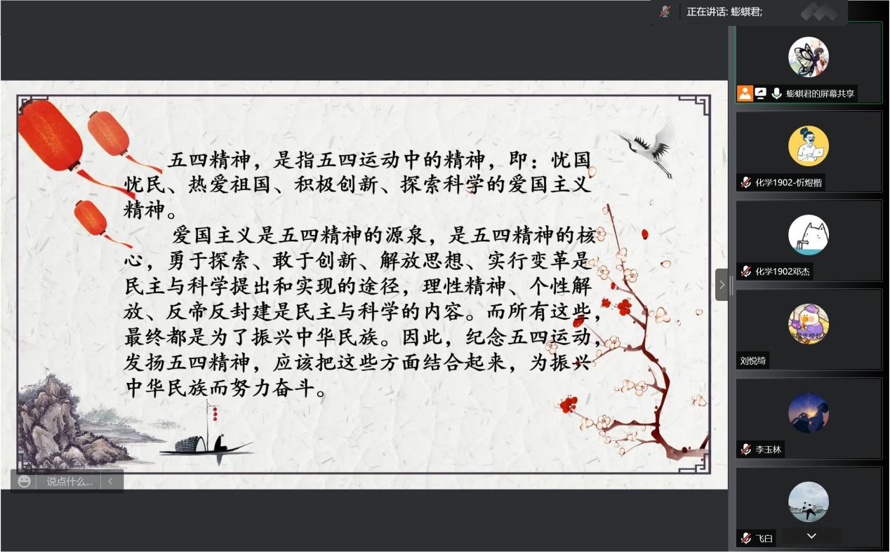 为重温五四精神,激发同学们奋发向上的昂扬意志,化学1902班于5月18日下午2点召开了题为“百年青春初心不忘,青春无悔强国有我”的主题团日活动,本次活动由团支书王鹏棋主持,以腾讯会议的形式开展。