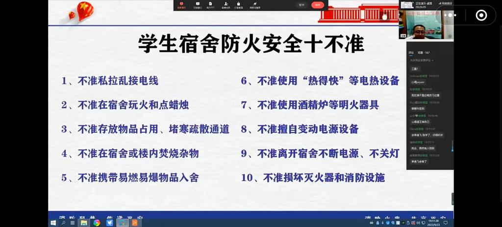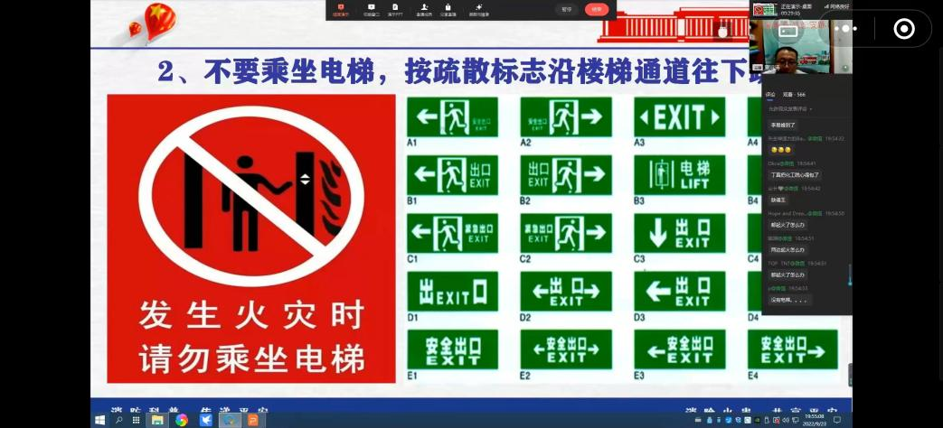 讲座过程中,夏老师淳淳教诲同学们,切忌用电功率超过最大负荷,切忌充电用电同时进行,切忌电路起火盲目灭火。为了让同学们能够加深印象,老师为同学们在线演示防毒面具和干粉灭火器的正确使用方法,并讲述了许多危险情况下的自救方法,让大家受益匪浅。