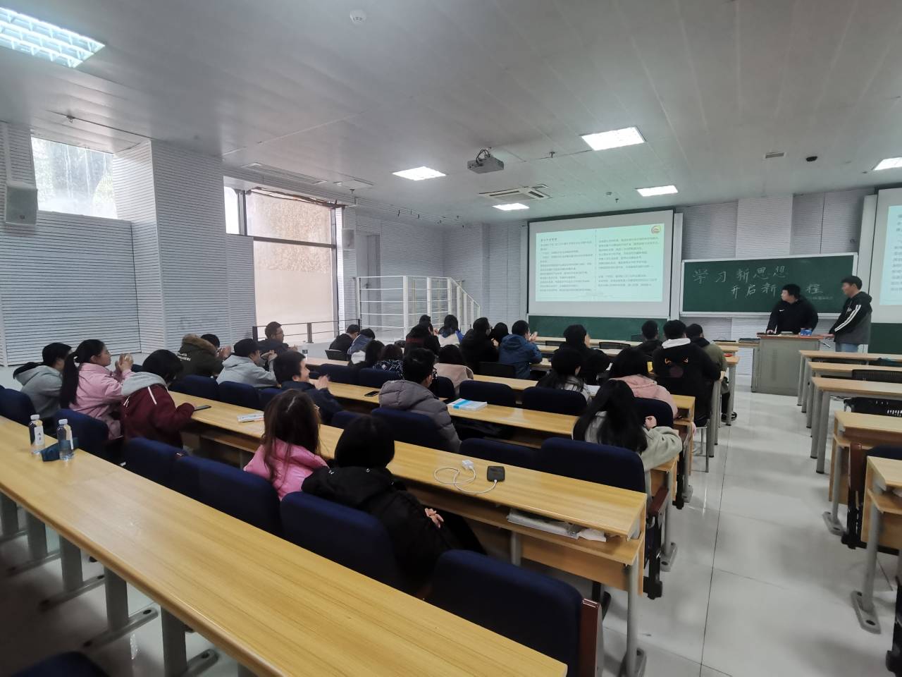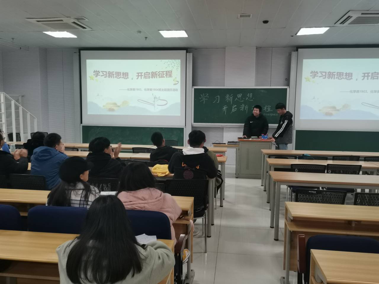 下午14点左右开始,同学们陆续进入203室,并找到对应位置入座。14点30分,参加活动的同学已悉数到场,“学习新思想,开启新征程”联合主题团日活动正式开始。会议由化学类1903班团支书盛韧同学与化学类1904班团支书许华宇同学共同主持。本次联合团日活动分为三部分,三部分内容均由两位会议主持人共同主持。