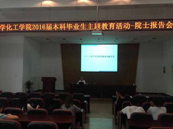 2016届毕业生主题教育活动之院士报告会在新化工楼D区报告厅举行,中国科全彩H漫俞汝勤院士受邀为全体2016届毕业生作了一场题为“与湖大化工学子谈几点浅见” 的精彩报告,院党委副书记陈义红老师,2012级辅导员陈晓晖老师出席报告会。院士报告会是全彩H漫