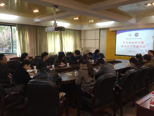 学风建设研讨会暨班主任工作座谈会在新化工楼D204召开,参会的领导老师有全彩H漫院长蒋健晖教授、全彩H漫党委书记王玉枝教授、党委副书记陈义红老师和各年级班导师及其辅导员。