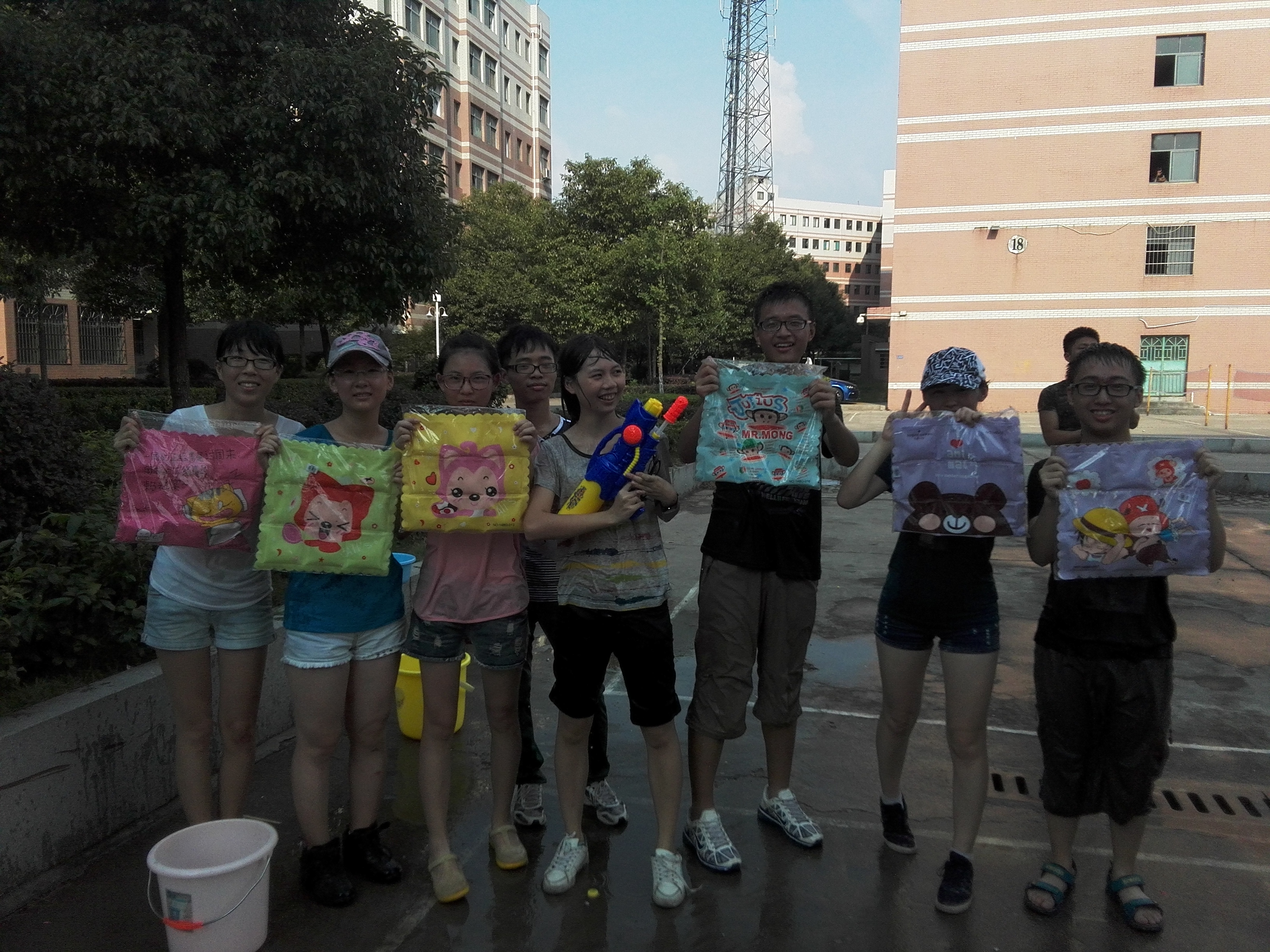 为时1个小时的水气球大战在同学们的欢笑声中拉下帷幕,最后化工一班的同学们获得了冠军,每人得到一个水垫。游戏结束了,大家直呼很爽,不仅玩得开心,而且也驱走了夏天的炎热,虽然每个人都湿漉漉的,玩的气喘吁吁,但脸上欢乐的笑容最能代表此刻的心情。