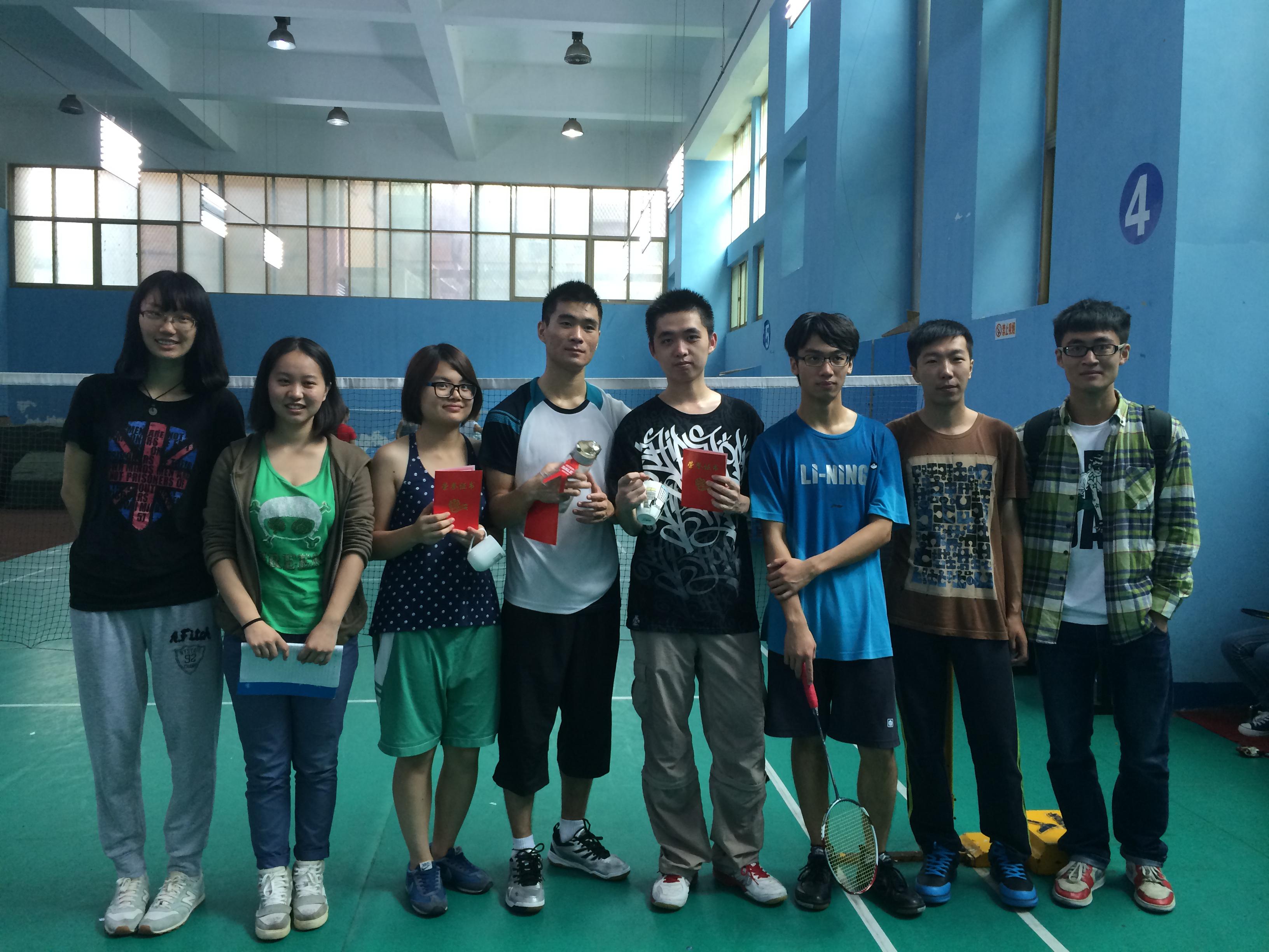 女子的比赛在12级应化一班的游兰芝和工艺二班的吕舒涵之间进行。由于两个选手水平稍有差距,进行两局比赛后,游兰芝就以二比零赢下了女子组的第一名。赛后,在羽毛球场给获奖的选手们颁奖合照。