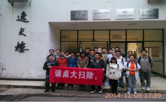参加过上次“课桌大扫除”的同学都觉得神奇药水可以擦除一切污渍,有了化工院的清洁药水,志愿者同学满怀斗志地开始了工作。因为马克笔的痕迹在地上已经留了一段时间,一开始并没有很容易地去除掉。志愿者们想到用清洁药水先浸泡一会儿,再用抹布擦掉,果然很有效。相对于之前的活动,本次活动人员分组明确,各组精密结合,各尽其力,在药水的神奇效用和志愿者们智慧思维的作用下,令清洁阿姨头痛的污渍不一会儿就被去除掉了。阿姨对神奇药水的作用十分肯定,并希望能借其除去主席台前的油漆块。不负众望的是,半个小时后,油漆块们就都销声匿迹了,阿姨也是连连称赞。志愿者们把桌面和桌椅的扶手擦得光洁如新,甚至连桌子的抽屉和桌角都仔仔细细地擦了一遍。面对着光洁的地面,听着阿姨的称赞,志愿者们都觉得心满意足,更是纷纷表示希望继续参与到下次的活动中来。