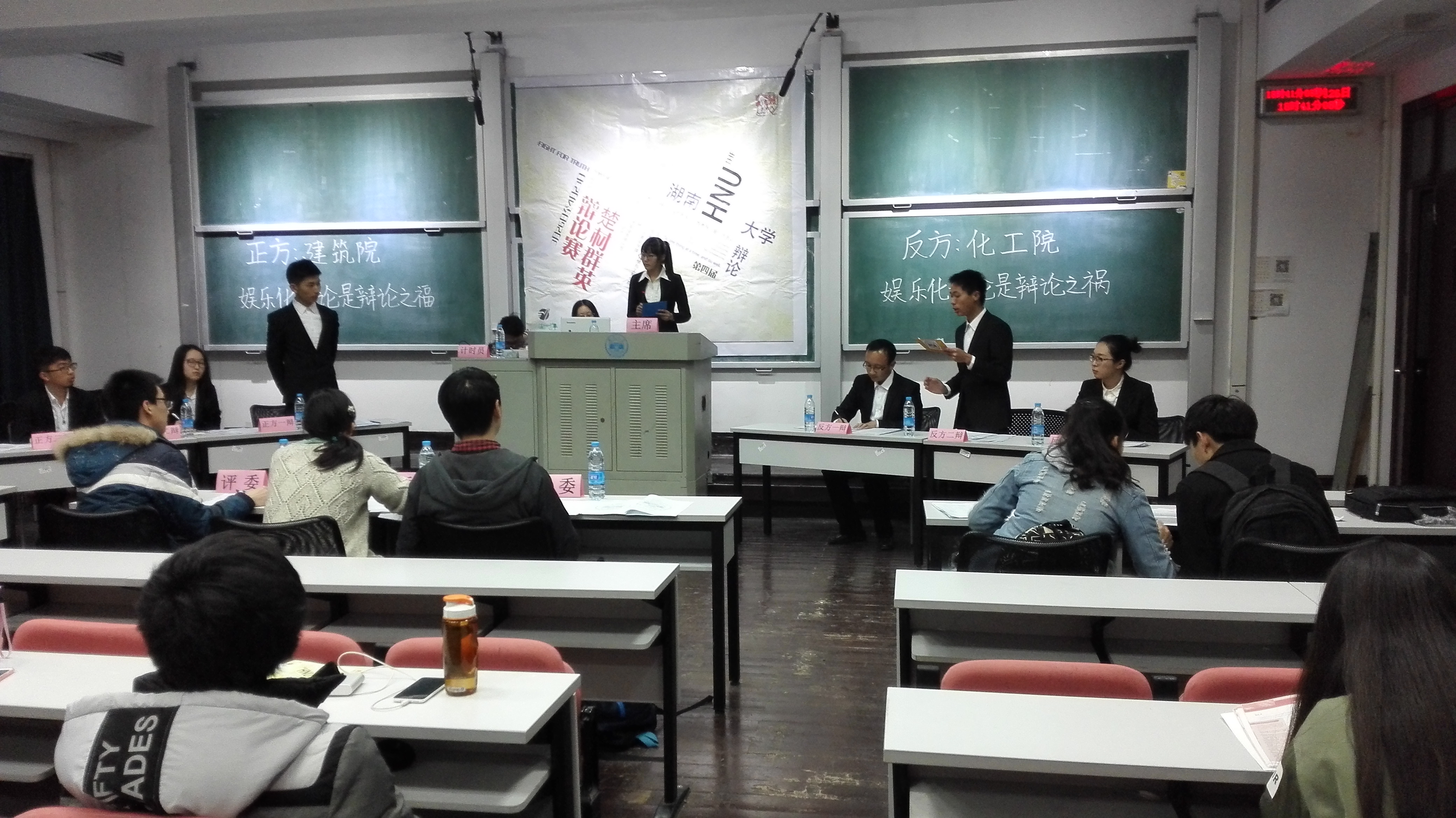 2016年3月26日晚上六点半,第四届麓山会讲•楚材群英辩论赛在中楼举行。中楼106举行的辩论赛是由正方建筑全彩H漫对阵反方全彩H漫