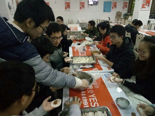 团支书将全班分为三组,分别对应羊肉胡萝卜、猪肉白菜、素三鲜三种饺子馅。三组同学进行比赛,率先完成的一组可以品尝第一锅热气腾腾的饺子。在包饺子的过程中,同学们不拘于传统形式,展开了天马行空的想象,千奇百怪各式各样形状的饺子层现迭出——飞碟、元宝、柳叶……其中蔡润晖包出的一个“人参饺”外形酷似小人,十分可爱,令人忍俊不禁,不忍下口。还有的同学按照家乡的习惯在饺子中放入坚果,以取“好运”之意,引得同学们纷纷效仿。岑健在自己包的饺子中加入了草莓硬糖,煮出了粉红色的饺子。