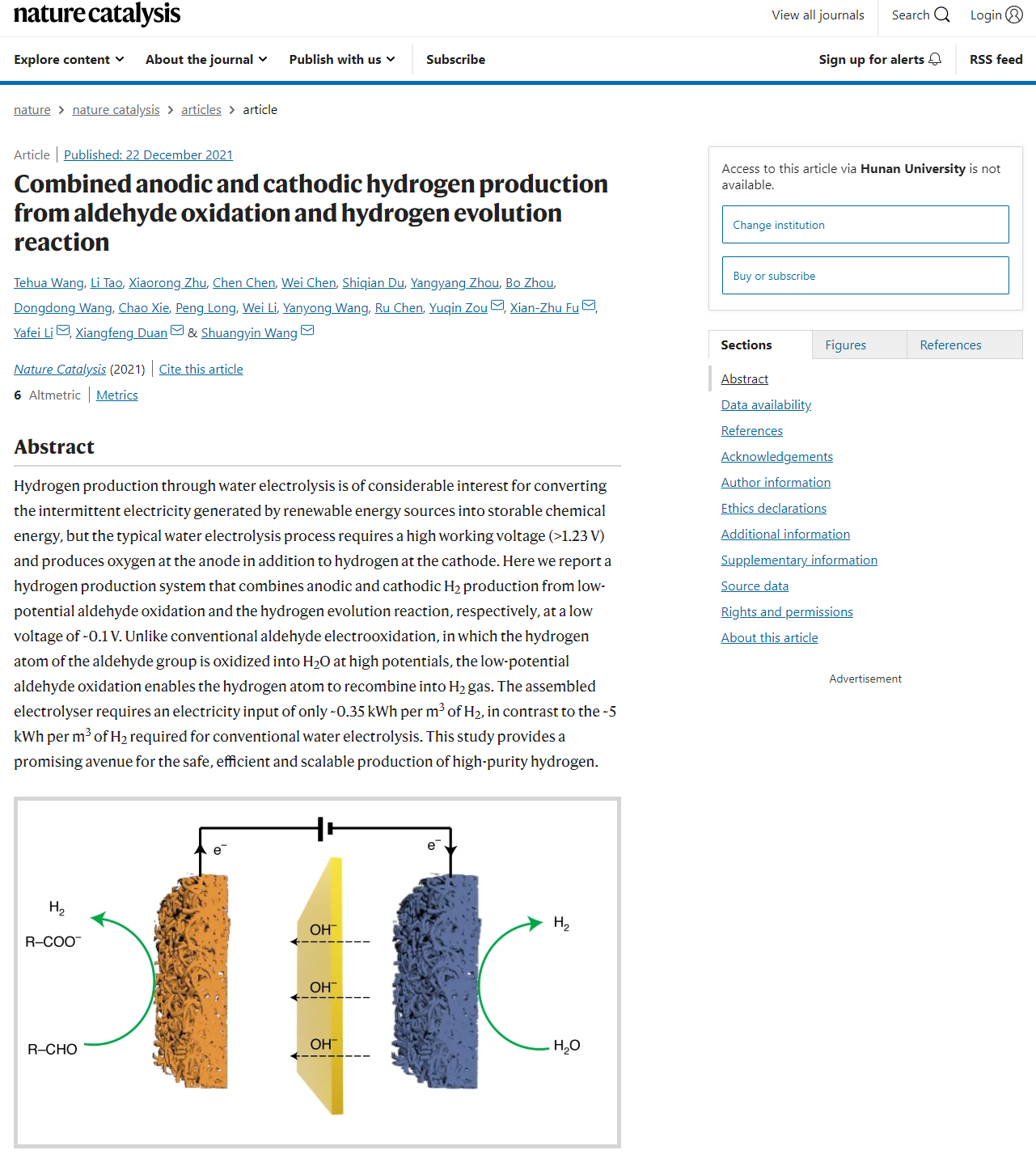 王双印教授开发出一种阴阳两极同时产氢的电化学双极制氢技术。相关研究以《Combined anodic and cathodic hydrogen production from aldehyde oxidation and hydrogen evolution reaction》为题发表在《自然-催化》(Nature Catalysis)期刊上。