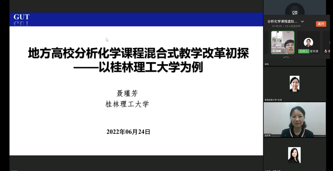 宦双燕教授主持,来自桂林理工大学的聂瑾芳教授为主讲嘉宾,她以桂林理工大学为例介绍了地方高校如何开展分析化学课程混合式教学改革。