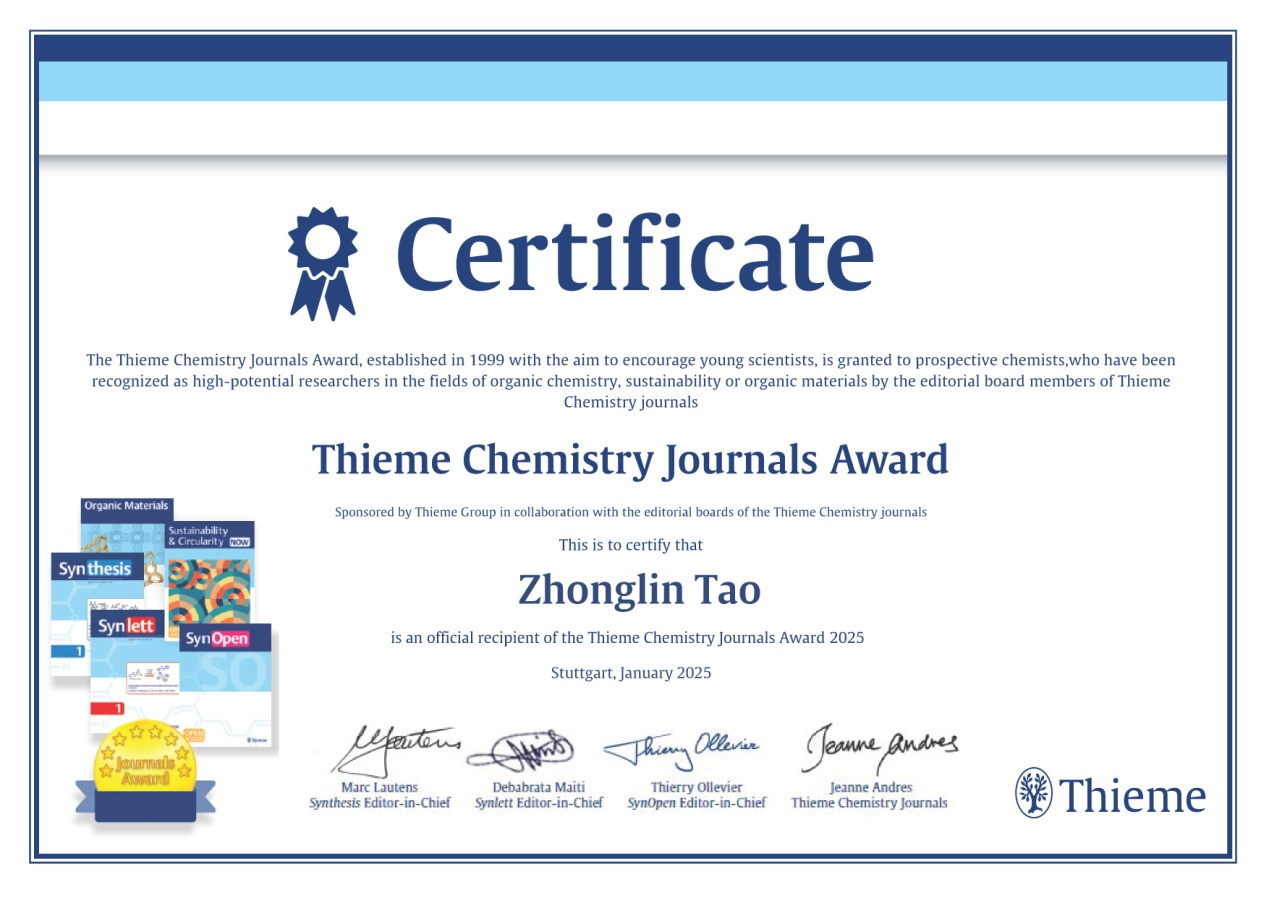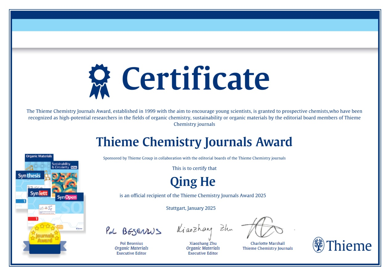 “Thieme Chemistry Journals Award”学术奖设立于1999年,每年颁发一次,面向来自全世界处于独立学术研究生涯早期、崭露头角的科研人员,获奖者由Synthesis、Synlett和Synfacts的期刊编辑委员会成员独家评选。该奖项关注从事化学合成与催化,以及在有机化学密切相关领域中有潜力的青年学者,旨在表彰和鼓励新一代有机化学家的科研成果。