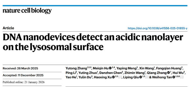 针对这一关键难题,谭蔚泓教授/邱丽萍教授团队与浙江大学徐浩新教授团队展开合作,研究人员开发了一种比率型质子响应核酸纳米探针,并在多种细胞模型中开展系统研究。研究团队首次发现,溶酶体表面存在一层pH低于中性胞质约0.2—0.7个单位的稳定“质子纳米层”,其范围可延伸至溶酶体膜外数至数十纳米。