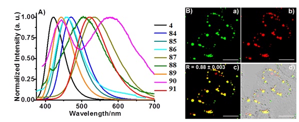 该研究以简单易得的末端炔烃、2-溴芳基酮以及酰胺为原料,以廉价易得的铜盐作催化剂,以水为溶剂,在无需使用昂贵的钯催化剂和配体条件下,实现了6-endo-dig环化选择性的绝对控制,产率高达95%。特别是以廉价、稳定、低毒的N,N-二甲基甲酰胺为原料,通过C‒N键裂解在线形成胺源,替代毒性大、易挥发的小分子脂肪胺,合成了传统方法不易获得的N-甲基化的1-萘胺衍生物。新型N,N-二甲基-1-萘胺衍生物具有良好的电子供体-受体结构、可调控的荧光发射(400~700 nm)、大斯托克斯位移(高达258 nm)和优异的脂滴(LDs)-标记性能。总之,周永波课题组所发现的三组分苯并环化反应为官能团化1-萘胺类化合物的合成提供了理想途径。