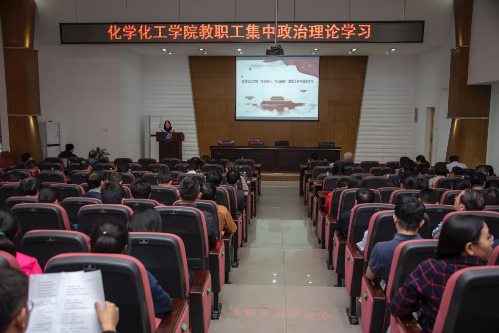 召开全院教职工大会,开展“不忘初心 牢记使命”主题教育集中政治理论学习。全彩H漫党委书记王玉枝教授和全彩H漫党委委员、化工应化党支部书记邓剑如教授分别作了宣讲,全彩H漫党委副书记范媛吉主持会议。