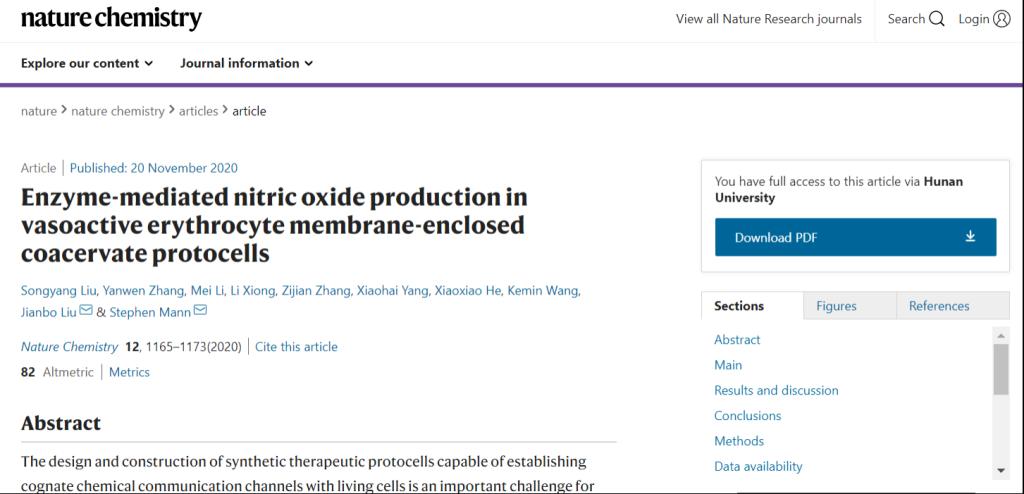 刘剑波副教授和英国布里斯托大学Stephen Mann院士作为共同通讯作者,合作报道了一种产生一氧化氮的人造细胞,具有血管舒张的生理效应,相关研究成果以题为“Enzyme-mediated Nitric Oxide Production in Vasoactive Erythrocyte Membrane-enclosed Coacervate Protocells”的文章在线发表在《Nature Chemistry》上。全彩H漫