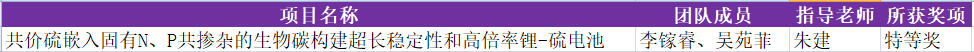 朱建副教授指导的“共价硫嵌入固有N、P共掺杂的生物碳构建超长稳定性和高倍率锂-硫电池”项目荣获特等奖。